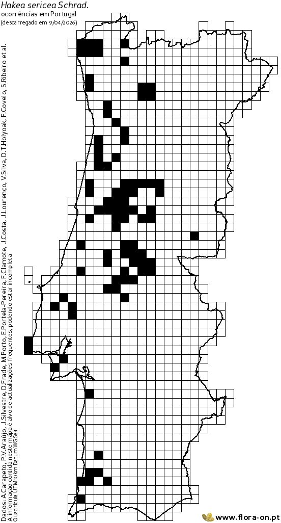 Espécie invasora em Portugal Continental, classificada legalmente desde 1999 (DL 565/99). (Como H. sericea Schrad.) Espécie invasora preocupante na União Europeia [C.I.R. (EU) 2016/1141]. 3.ª actualização da lista em 2022-08-02. (Como H. sericea Schrad. & J.C.Wendl.)