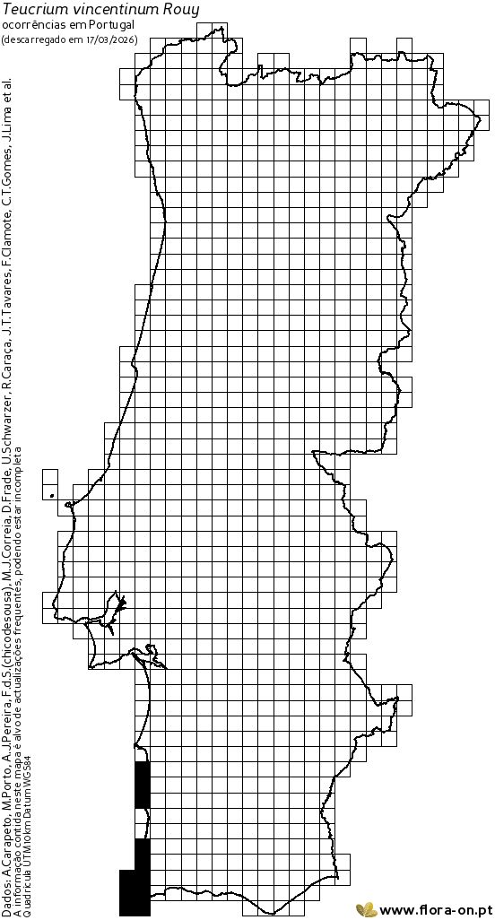 Teucrium vincentinum é um pequeno arbusto endémico do litoral sudoeste de Portugal continental. Apesar de apresentar extensão de ocorrência e área de ocupação reduzidas, ocorre com grande abundância em vários pontos da sua área de distribuição. A população estima-se em várias dezenas de milhar de indivíduos maduros e suspeita-se que esteja estável ou que a sua redução não seja significativa. A planta é avaliada como Pouco Preocupante uma vez que é ainda muito abundante, principalmente no extremo ocidental do Algarve, onde apresenta uma distribuição quase contínua nas arribas litorais e onde existem vários locais sem ameaças assinaláveis. Ainda assim, estão identificadas várias causas de pressão como a degradação do habitat por pisoteio e estacionamento de viaturas, a expansão agrícola, a expansão de exóticas e o desenvolvimento urbano-turístico, contudo não existem indícios que sugiram que a população possa entrar em declínio significativo no futuro próximo. Para assegurar o bom estado de conservação da população sugerem-se medidas de controlo de exóticas na sua área de distribuição e o aumento da fiscalização sobre o pisoteio excessivo nas áreas mais visitadas por turistas. A população deverá ser alvo de monitorização, que permita acompanhar a tendência populacional e detetar efeitos de pressões não previstas ou subestimadas.